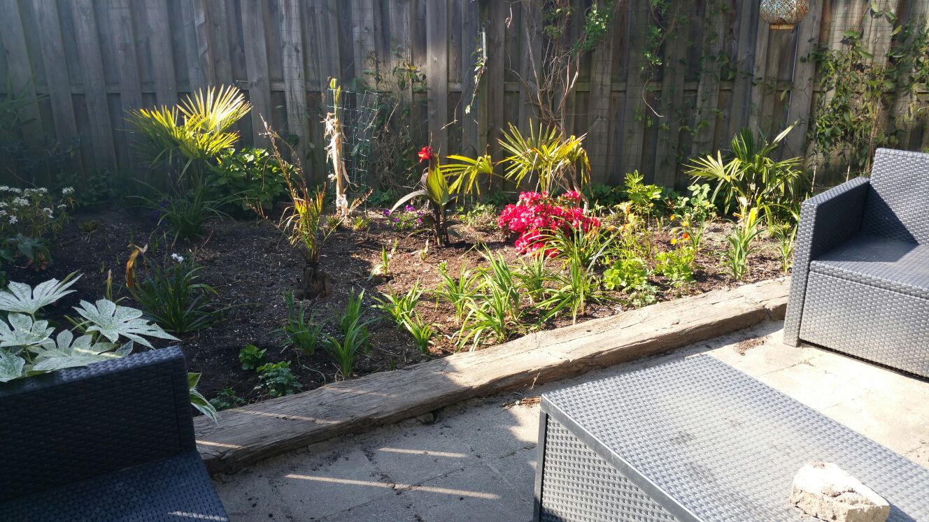 De smalle border die schuin naar achteren liep heb ik recht getrokken. Die staat nu vol canna's, Colocasia pink china, Fatsia, daglelies, Crocosmia, ooievaarsbek en nog wat ander klein spul.