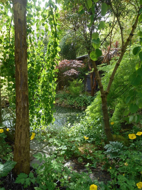 Met het donkerrode blad is Cercidiphyllum japonicum 'Rotfuchs'. Dit is een langzame groeier vergeleken bij de soort. De plant rechts daarvan is Acer x conspicuum 'Silver Cardinal' (synoniem Acer rubescens 'Silver Cardinal'). Deze bontbladige Acer is gevoelig voor zonnebrand zoals veel variëteiten Japanse esdoorns. Het verzamelen van Acers is een van mijn passies en ik kan de verleiding vaak niet weerstaan om weer met een cultivar thuis te komen. Voorlopig is zo 'n nieuwkomer gedoemd in een kuip te verblijven totdat ergens een plek vrijkomt.
