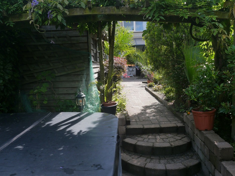 Dit jaar heb ik de stenen verwijderd en planten in het midden van de tuin geplaatst. Er komen grindpaadjes omheen met stapstenen. Ook heb ik wat nieuwe klimmers en bamboes gekocht, zodat alles mooi dicht kan groeien. De potplanten zijn verhuisd naar de serre en naar het plateau bij het water.