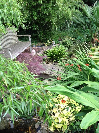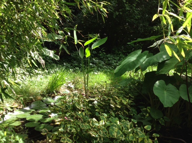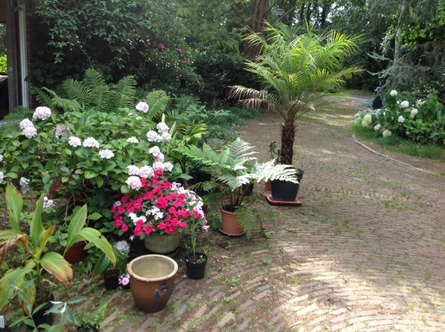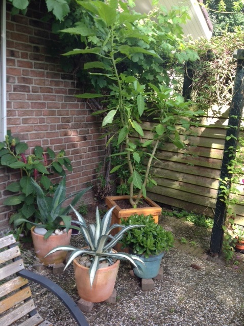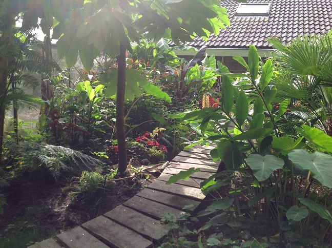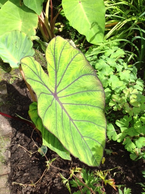 - Zijaanzicht tuintje. Colocasia Jack's Gaint.