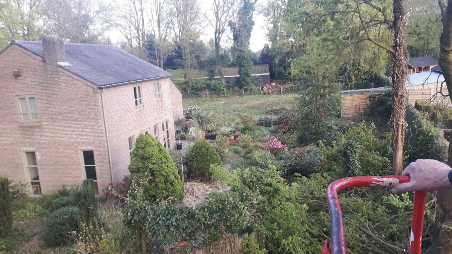 Afgelopen mei hebben de nieuwe woning betrokken en van binnen moet er het een en ander gebeuren maar buiten was het een grote bende. afgelopen 15 jaar hadden de vorige bewoners niks maar dan ook echt niks aan de tuin gedaan. Kunnen jullie wel voorstellen hoe het erbij lag. Aangezien het toen mooi weer was dacht ik begin vast met wat bomen om te leggen. Toen ik bezig was zag ik wel dat de rest in mijn ogen ook zo'n beetje allemaal weg kon. na een weekje fanatiek zagen en hakken was alles mooi kort. zodoende maar eens even een grote graafmachine laten komen en die heeft alles eens flink omgezet. was ik mooi oa van de hedra af die compleet de tuin had overgenomen en tegen de woning en muur aan het groeien was.