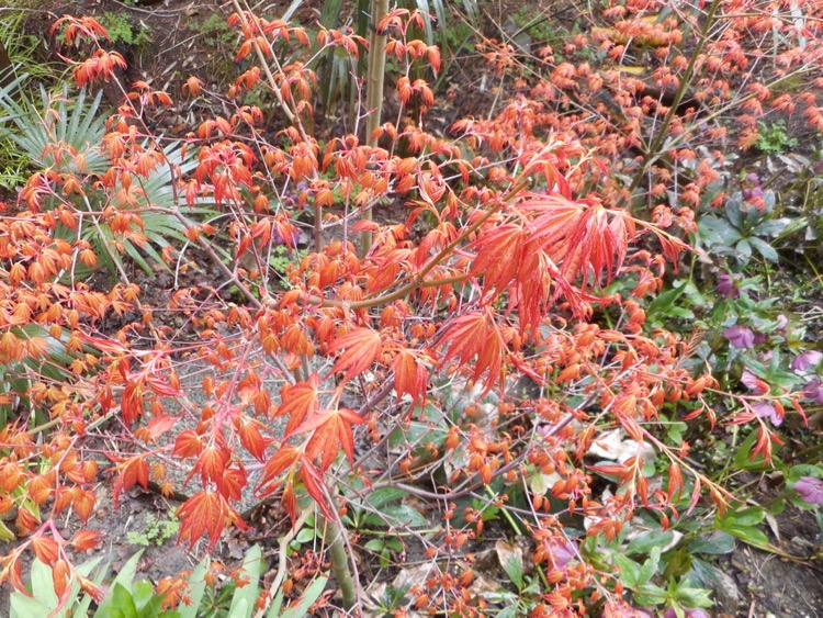 Vandaag beleven we hopelijk de laatste winterstuip, met 6°C en een NNW windkracht 6 is het nog niet bepaald aangenaam. In de zon en beschut voor de wind valt er al genoeg te genieten. Een Acer met oranje blad vormt de jaarlijkse primeur. Rhaphiolepis umbellata mocht voor de foto alvast even uit de kas. Bij de bolletjesvaren verschijnen nieuwe krullen. Onoclea sensibilis dankt zijn Nederlandse benaming aan de sporendragers. Het kangaroepootje is de nieuwste aanwinst. Ik ben benieuwd hoe de hernieuwde kennismaking met deze Anigozanthos 'Beauty Star' zal verlopen. Bij een vorige gelegenheid was het genoegen van te korte duur. Enkele palmen genieten hier een VIP behandeling zoals de Trachycarpus princeps 'New From' en een mini Cerifera in een sierpot die is meegekomen uit Japan.