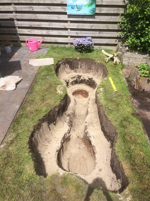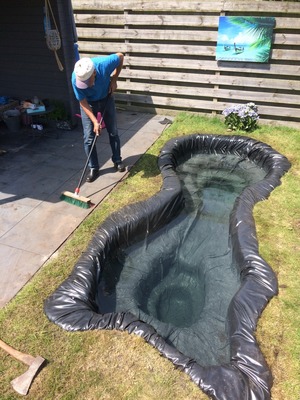 Beetje brekerszand voor demping. Plus een tip voor wie nog een vijver wil aanleggen. Er komt veel meer zand uit dan je verwacht (veel meer!).