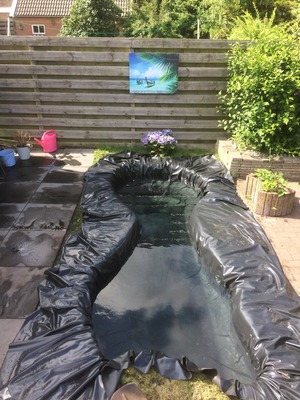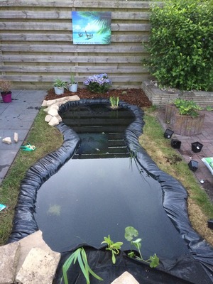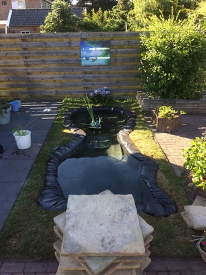Ik had liever een aflopende oever gehad maar wegens ruimte gebrek kon dit niet omdat ik toch qua volume een “grote” vijver wou.