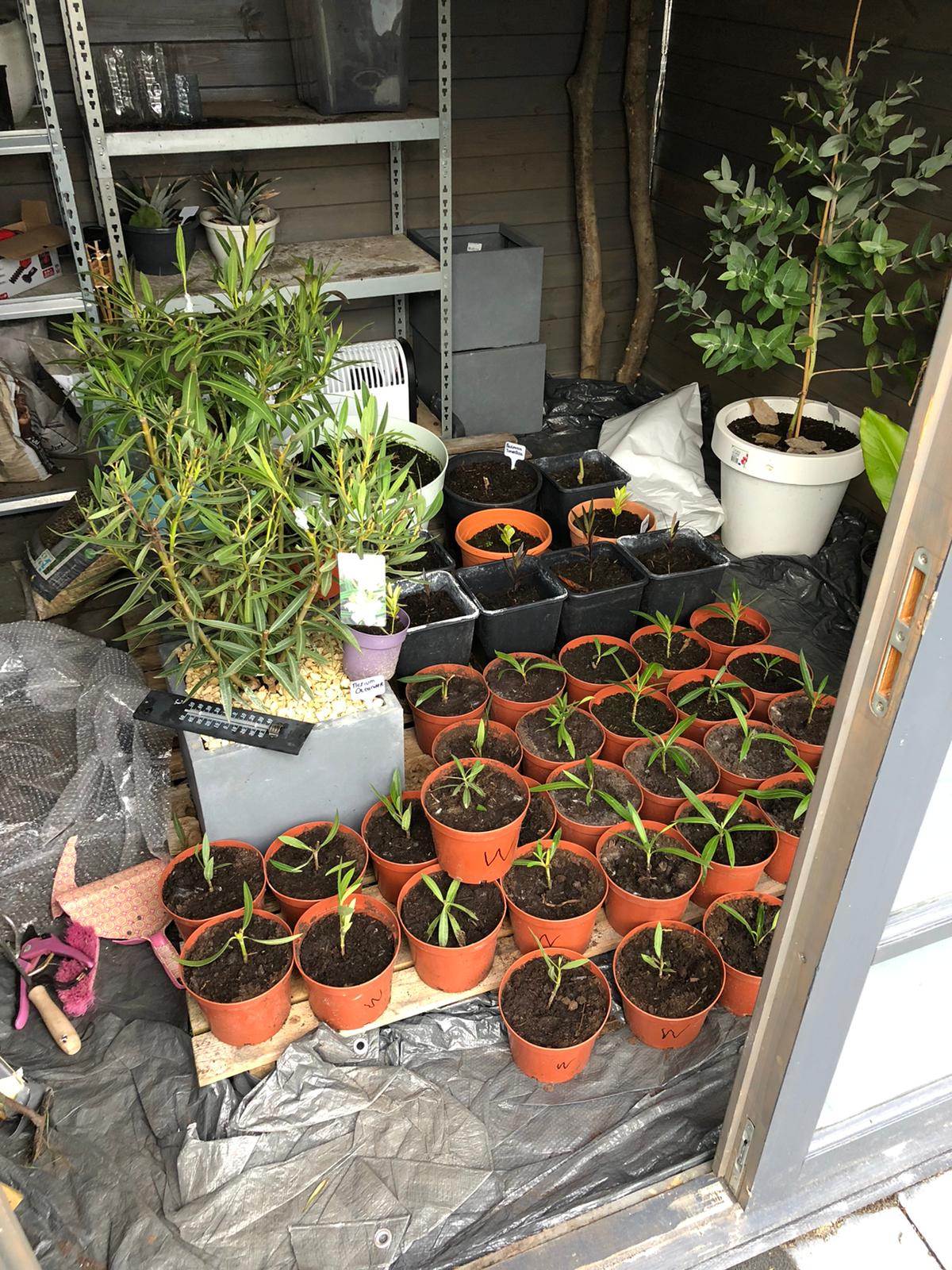 Ik ga ze afwisselen op deze manier: Oleander roze struik , Oleander wit stam , Oleander rood struik , Oleander roze stam , Oleander wit struik , Oleander rood stam , Oleander roze struik. De pot die ik overhoud doe ik denk ik een oleander die ik doormiddel van enten drie kleuren geeft in. Ik heb de Oleander wit struik en roze stam al. De rest kweek ik op vanuit stek , de rode moet ik nog een van aanschaffen.