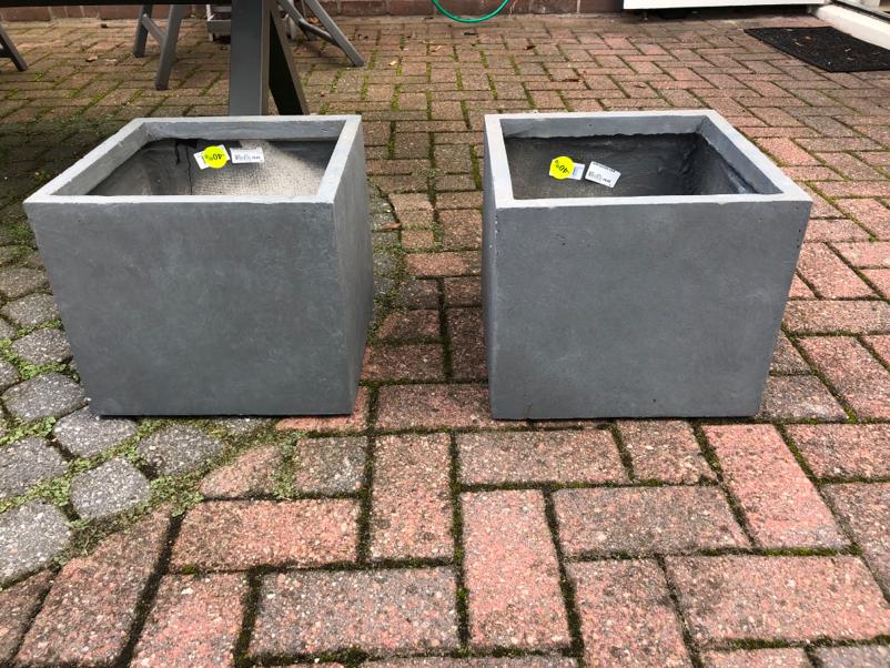 Ik heb geluk gehad , het tuincentrum bij mij in de buurt had op het einde van dit jaar grijze potten in de aanbieding die precies bij de kleur van het tuinhuis en de betegeling passen.