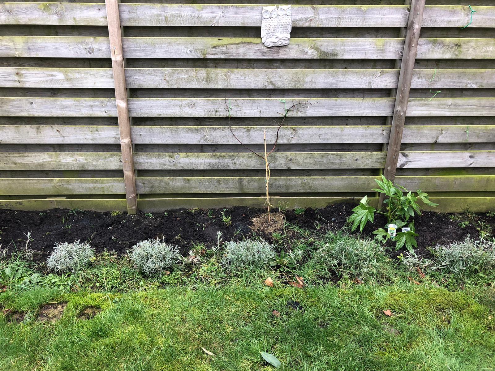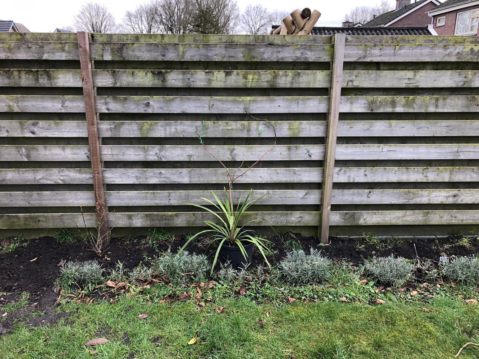 Over de gehele border heb ik Campanula als eerste rij aangeplant. Deze bloeit meestal 2 keer in het jaar met veel paarse klokjes en bijen en hommels zijn er gek op. Hierachter een rij Lavendel waar de bijen en hommels nog gekker op zijn. Ik heb van het snoeiafval van de lavendel dit jaar heel wat boeketjes kunnen weggeven en kunnen stekken. Met de stekken ga ik de gaten van de rij wat opvullen. De klimmer aan de schutting is Campsis radicans “Madame Galen” een rood , oranje trompetklimmer , deze is me onder de naam “Flava” verkocht , de felgele trompetklimmer maar ik ben blij dat deze het toch niet is achteraf , waarom wordt zo duidelijk. Rechts een Fatsia Japonica. Links van de trompetklimmer komt een jonge Ginkgo te staan.