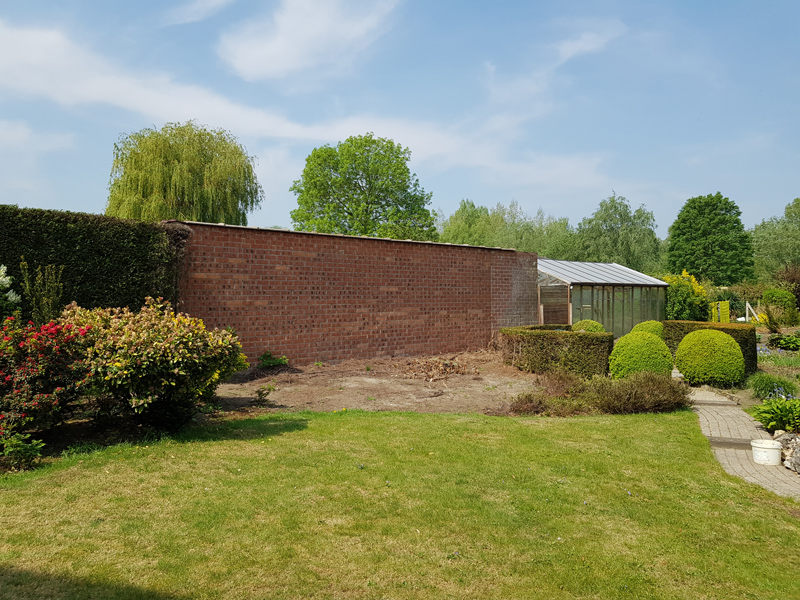 Dicht aan de woning, de planten links zijn verplaatst naar een stuk rechts van de tuin dat nog behouden blijft. Het pleintje met haag blijft bewaard. Gras is ook weg intussen.