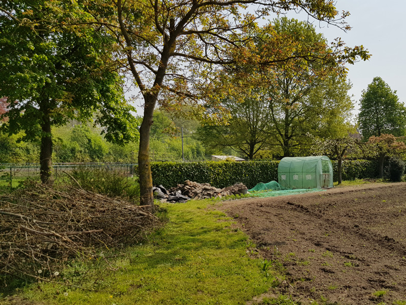 Helemaal achteraan het perceel enkele bomen en materiaal dat we bewaren voor eventuele recuperatie. En wat hout.
