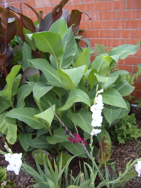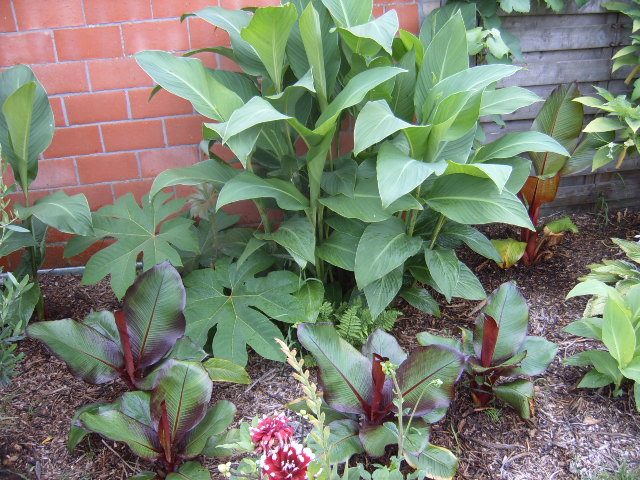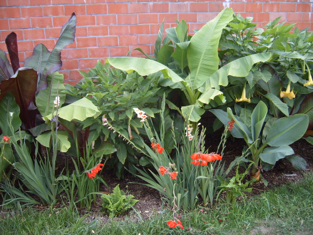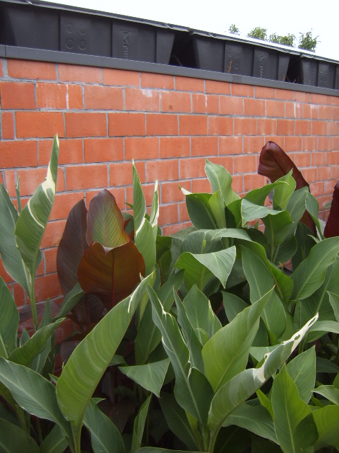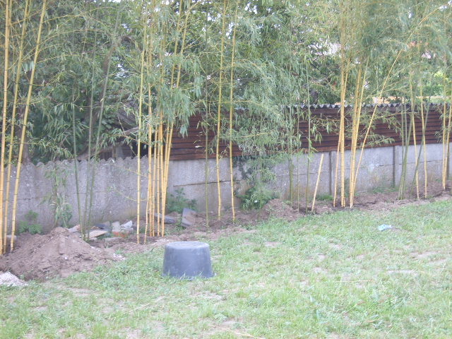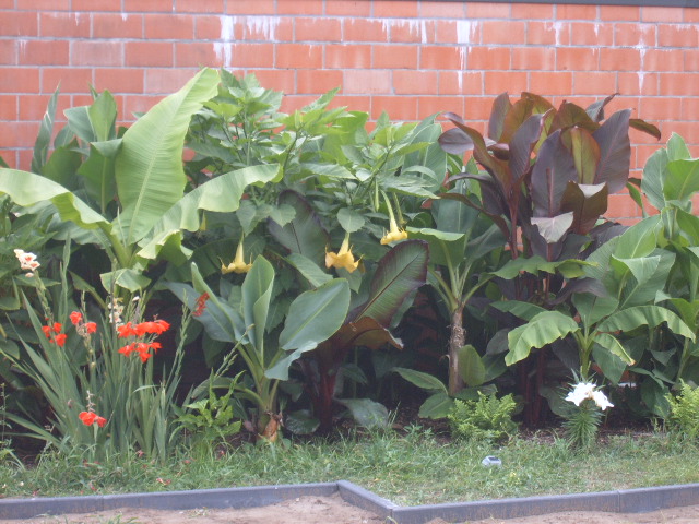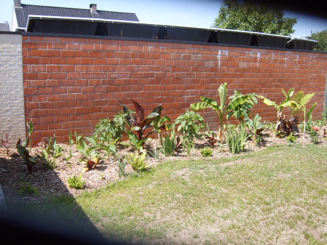 De canna's staan in de zon van s'morgens tot rond een uur of 14. Het is het eerste jaar dat ze in de grond steken. Sommige waren zeer kleine knollen. De bamboe is de Phyllostachys aureosulcata en Phyllostachys aurea wisten ze me te zeggen (groene en gele reuzebamboe). Heb ook nog één stek van de nigra soort staan.
