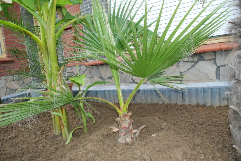 Bovenste foto schrijf je : Probeersel om Phoenix Canariensis in volle grond door volgende winter te krijgen.