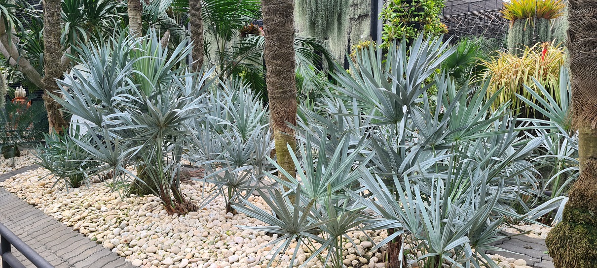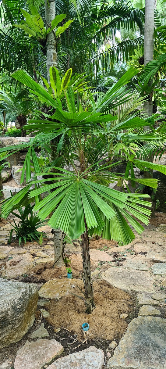 Ik vermoed Brahea armata (Rob?) die in de tropen wat sneller de hoogte in gaan waardoor de omvang van de stam net iets minder is.