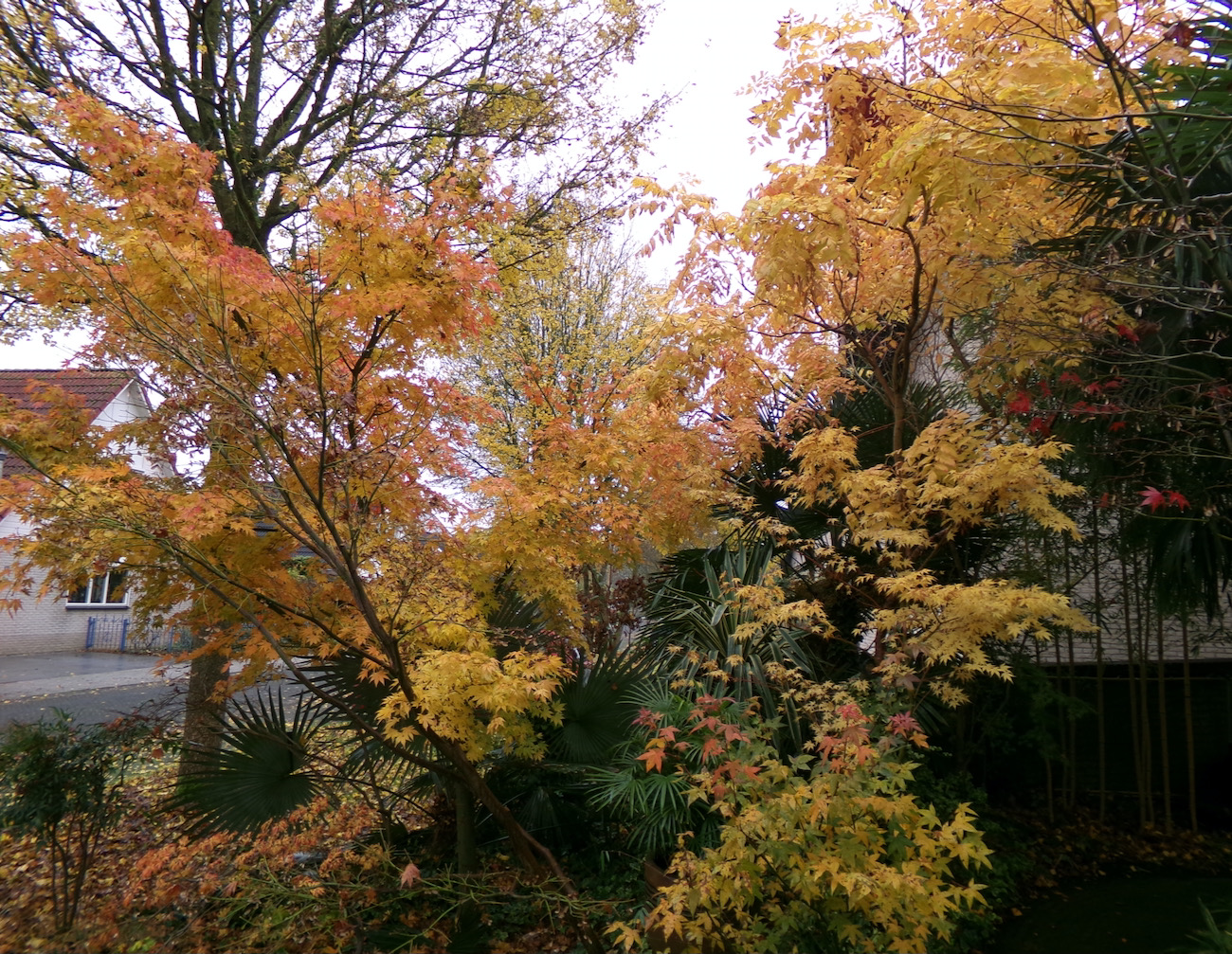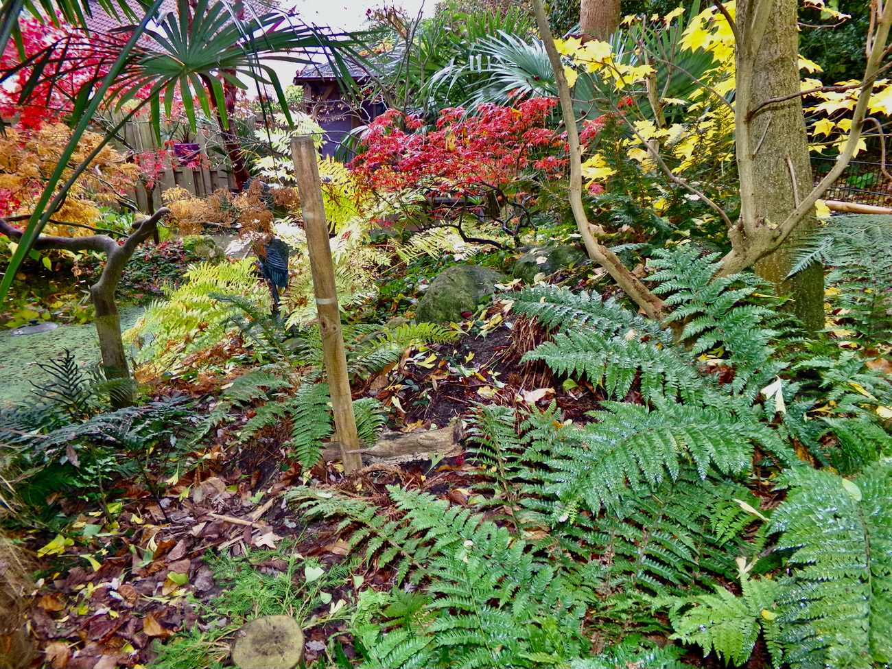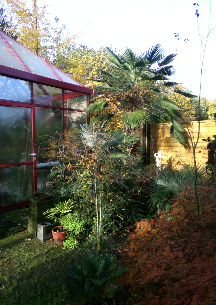 Rob, je ziet dat de geminisectus nog niets is opgeschoten. Met krap 2 waaiers en een speer is het resultaat aan het einde van elk seizoen ongewijzigd. Als kuipplant gedijde deze beter. De tuin is essentie ongewijzigd met uitzondering van de grotendeels geruimde bamboe. De rhizomen zijn achtergebleven en bezorgen ons nog werk genoeg. Voorzover mogelijk zijn er andere planten ingezet. Bij het open rhizoom van Phyllostachys is nog wel een plantgat uit te hakken. Bij Fargesia is dat niet te doen zonder professioneel materiaal.