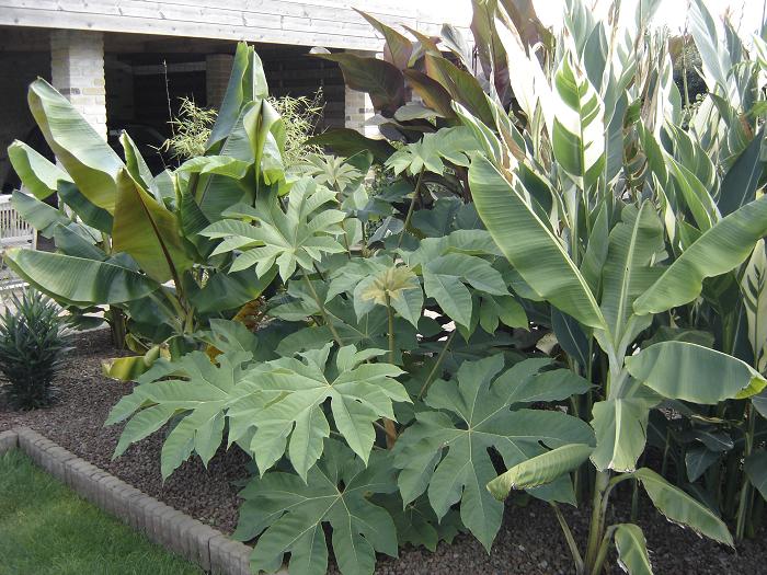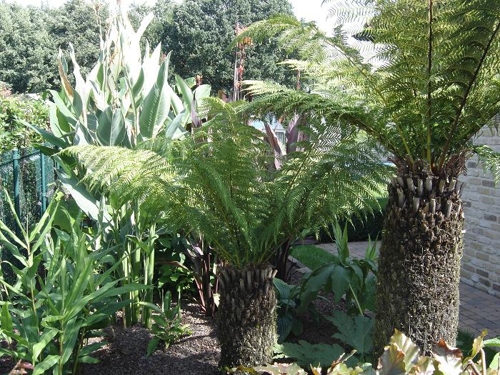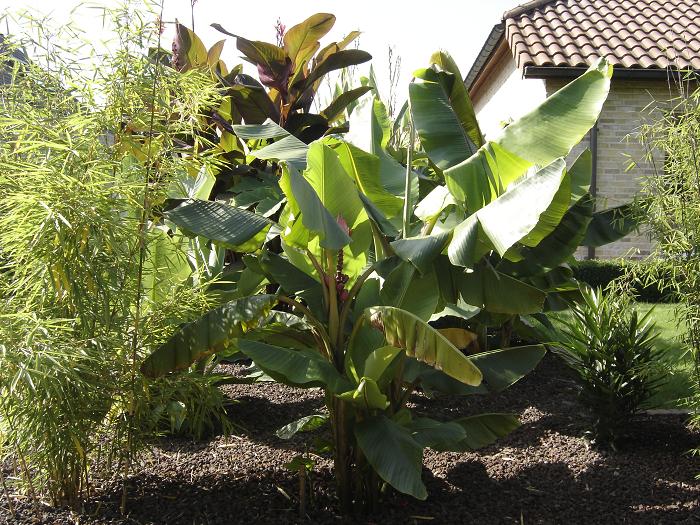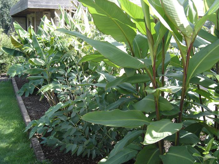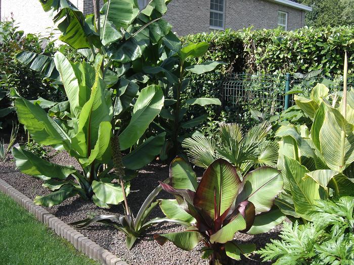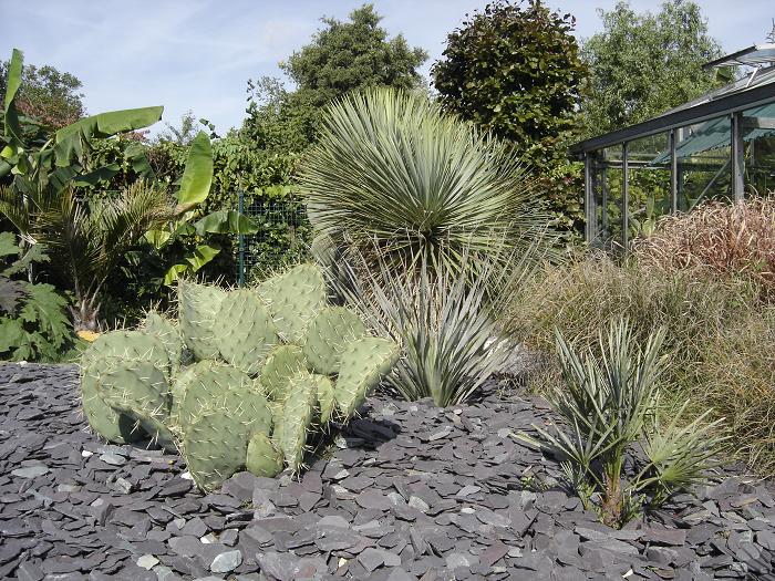 Djoeke, In het exotengedeelte heb ik lavakorrel als bodembedekker gebruikt. Dit heeft diverse voordelen oa: rot niet, verzuurt niet, waait niet weg, is goed ademend en houd het onkruid tegen terwijl de Canna, Musa- en andere scheuten er geen hinder van hebben. In het woestijnstukje heb ik met 'Canadian slate purple' gewerkt, omdat ik dat bijzonder mooie steentjes vind.