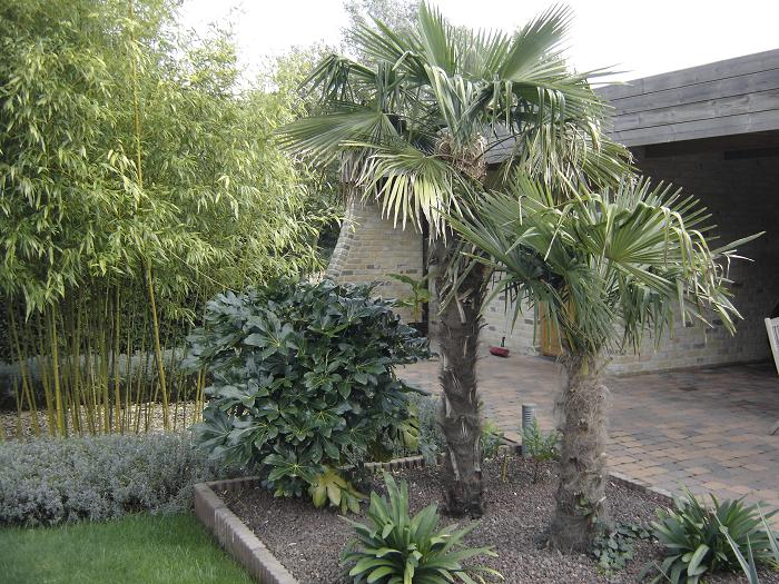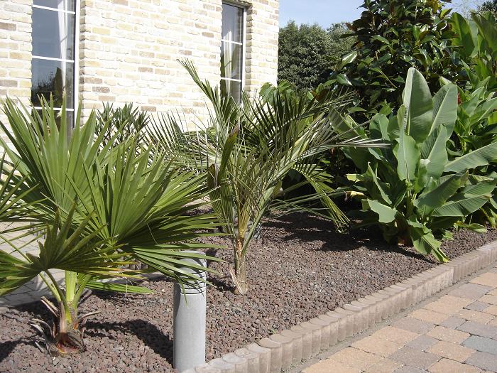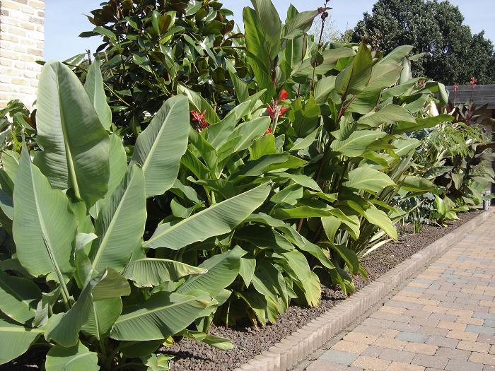 Djoeke, In het exotengedeelte heb ik lavakorrel als bodembedekker gebruikt. Dit heeft diverse voordelen oa: rot niet, verzuurt niet, waait niet weg, is goed ademend en houd het onkruid tegen terwijl de Canna, Musa- en andere scheuten er geen hinder van hebben. In het woestijnstukje heb ik met 'Canadian slate purple' gewerkt, omdat ik dat bijzonder mooie steentjes vind.