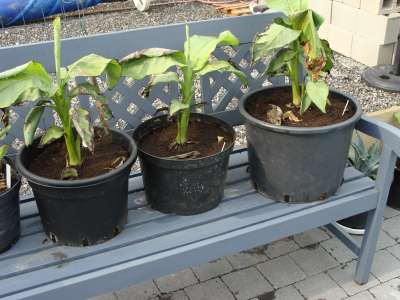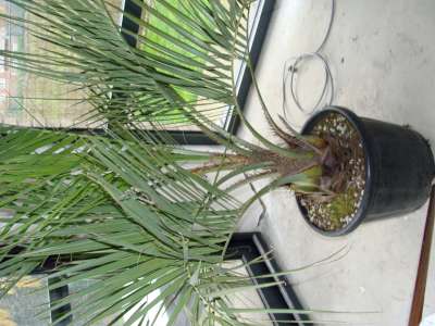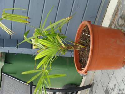 Hier enkele foto's van mijn planten, de kleine Fortunei had speerrot en behandelt met bordeause pap en helemaal hersteld, jammer de enige die zich hersteld heeft, de andere kleine met dakje en de grote met dakje is nog niet hersteld en vrees er ook voor dat dit nog ooit komt. Na zo'n lange en strenge winter wil ik niets verliezen en heb al mijn musa's uit de grond gehaald en binnen in pot gezet lekker warm en droog in huis. Verder heb ik nog enkele aanwinsten gedaan. De butia capitata en de fortunei komen van Palmgarden en zie de cactus krijgt ook scheuten die ik in de lente ga ompotten.