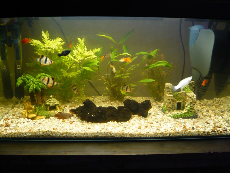 Sylvie: omdat aquariumhouden al 2 jaar op een laag pitje staat bij mij zit er niets speciaals in. In de grote bak wat kardinaaltetra's (Cheirodon axelrodi), die lijken sterk op neontetra's maar zijn groter en hebben meer kleur.