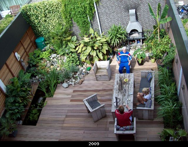 deze tuin is omringt door schuttingen ter hoogte van 3.20 m en het grote voordeel is dat ik weinig last heb van de wind.Nadeel is dat de vijver te veel in de schaduw ligt waardoor de 2 schildpadden vaker een stukje door de tuin lopen om wat zon te vangen. bedoeling van mij is aan de schaduwkant zoveel mogelijk varens te plaatsen en aan de andere kant bananen en andere tropische planten.
