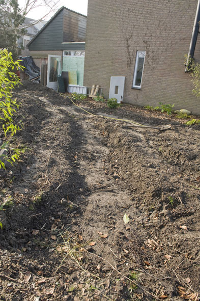 Er komt ook een beek, met een ronde diepere uitmonding, maar zonder karpers, de beek is voor de kikkers, padden en salamanders die we veel in de tuin hadden vorig jaar en ik hoop wel dat ze er nog zijn of terug komen.