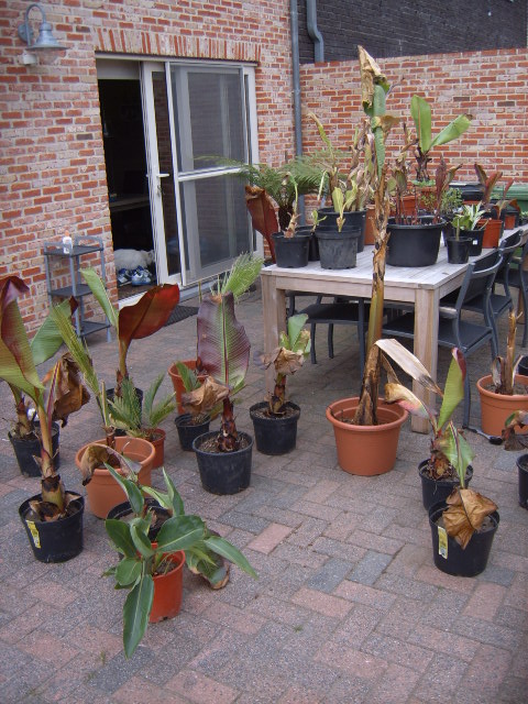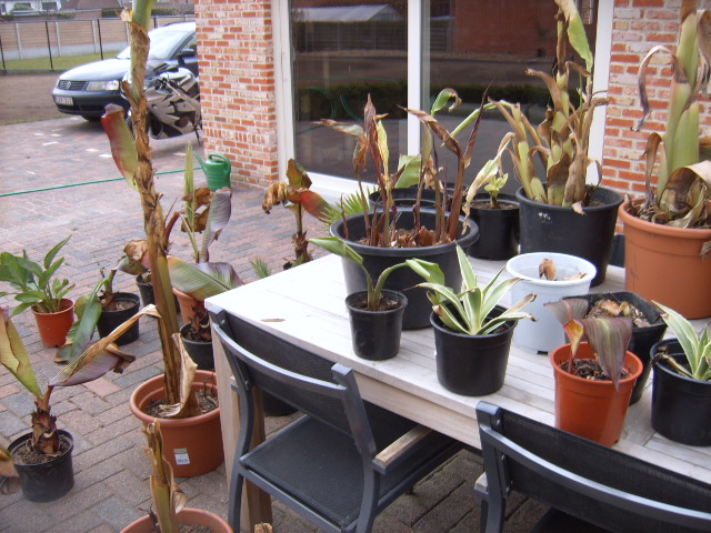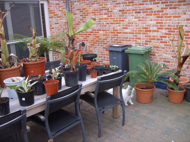 Voorlopig de helft van de planten al van zolder naar beneden gebracht zodat ze aan het zonnetje op het terras kunnen wennen.