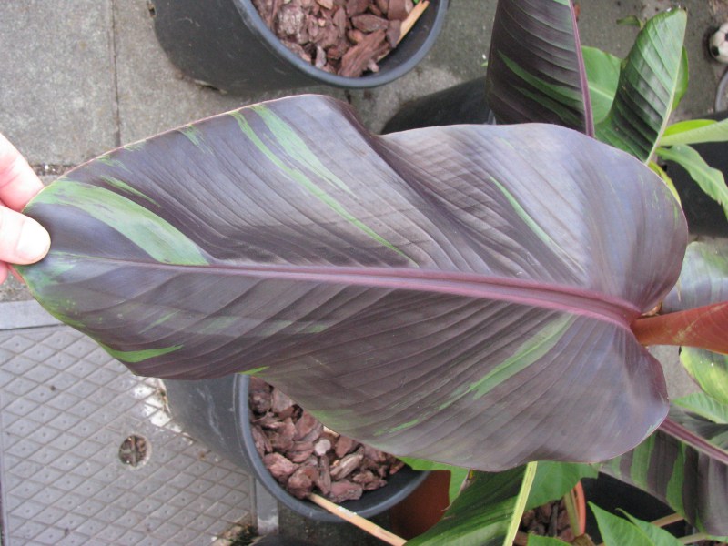 Musa sikkimensis 'Red Tiger' waarvan het eigenlijk een rood blad is met enkele groene strepen in plaats van een groen blad met rode strepen :)