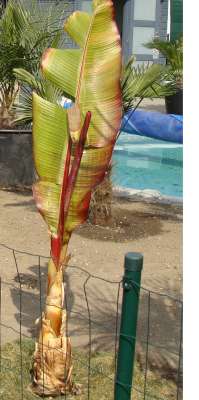 hier zie je zo de wortels kruipen over de grond :) hopelijk is dat goed, heb al verschillende scheuten afgestoken en allen met wortels, neem alles mee in oktober naar CB, laat ze wel in de auto staan. Ook mijn cheesmanii maakt alweer 3 scheuten met al een paar van bijna 1 meter hoogte, deze ga ik ook afsteken. Ga er toch eentje bewaren want ik vind deze banaan echt heel mooi met die paars grijze stam, niet gedacht dat dit zo een mooie banaan was met de groene bladeren en de rode lijn erin anders had ik deze al veel eerder in mijn tuin.