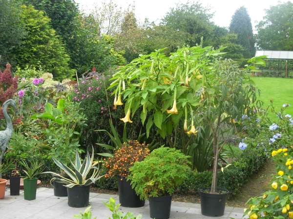 - linkerkant met brugmansia, stukje terras met potten : oa agave , sierappelsien, eucaliptus, plumbago, abutilon en nog veel meer maar op deze foto niet te zien