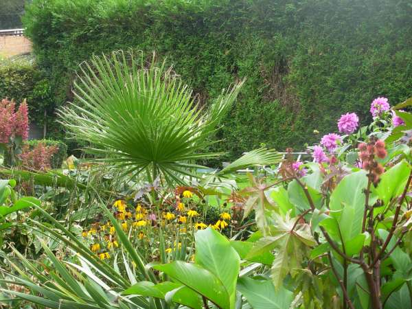 - washingtonia, canna's, ricinus en veel bloemen