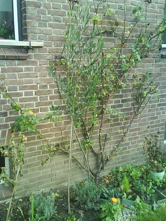 Ook dit voorjaar (rond mei) geplant: Olea europaea, volgens de verkoper uit Portugal (Algarve) geïmporteerd. Hij staat maar 40 cm van de muur af. Hij heeft al veel weertypen doorstaan: droogte, natte zomer en nachtvorst tot -4 graden. Toen ik hem kocht had hij al kleine olijfjes aan enkele takken. Rechts kun je een kleine Cypressus macrocarpa 'Goldcrest Wilma' zien. Deze schijnt de meest winterharde Monterey cypres te zijn. Heb elders in Nijmegen al één van anderhalve meter gezien in de volle grond.