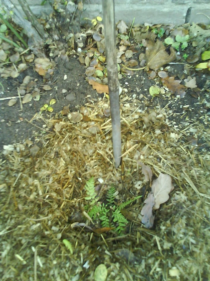 Zoals je op de vorige foto misschien al kon zien staat er naast de Ficus een Dicksonia antarctica met al een beetje stro eromheen zodat ik hem zonodig vlug kan afdekken. Het is een zaailing van hoogstens een jaar oud en het is een experiment om deze nu al in de volle grond te houden. Ik heb ook zo'n exemplaar in pot staan.