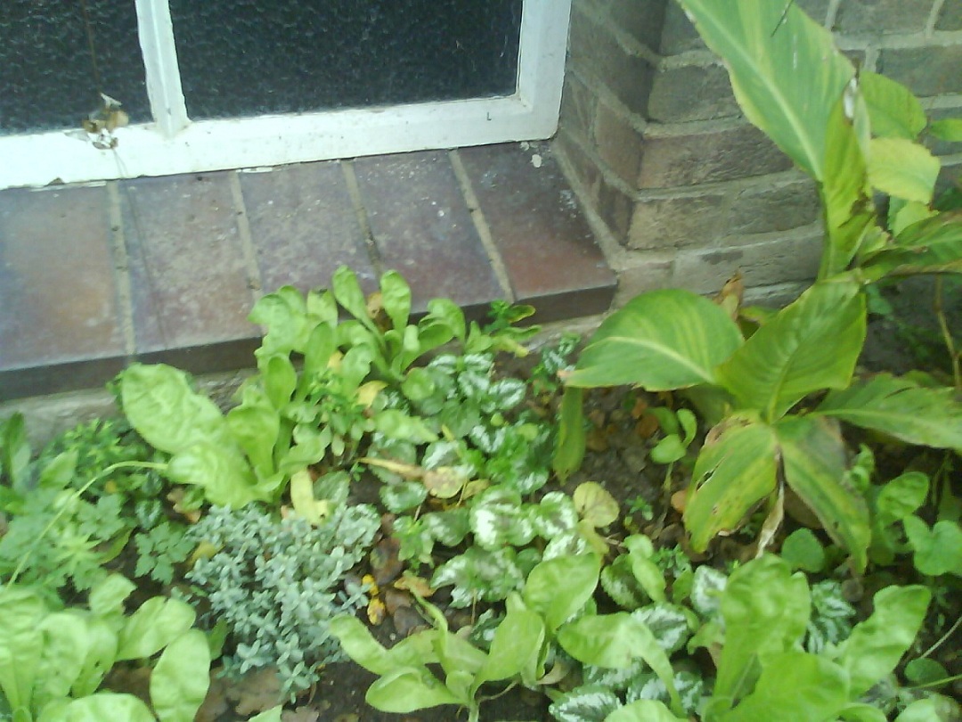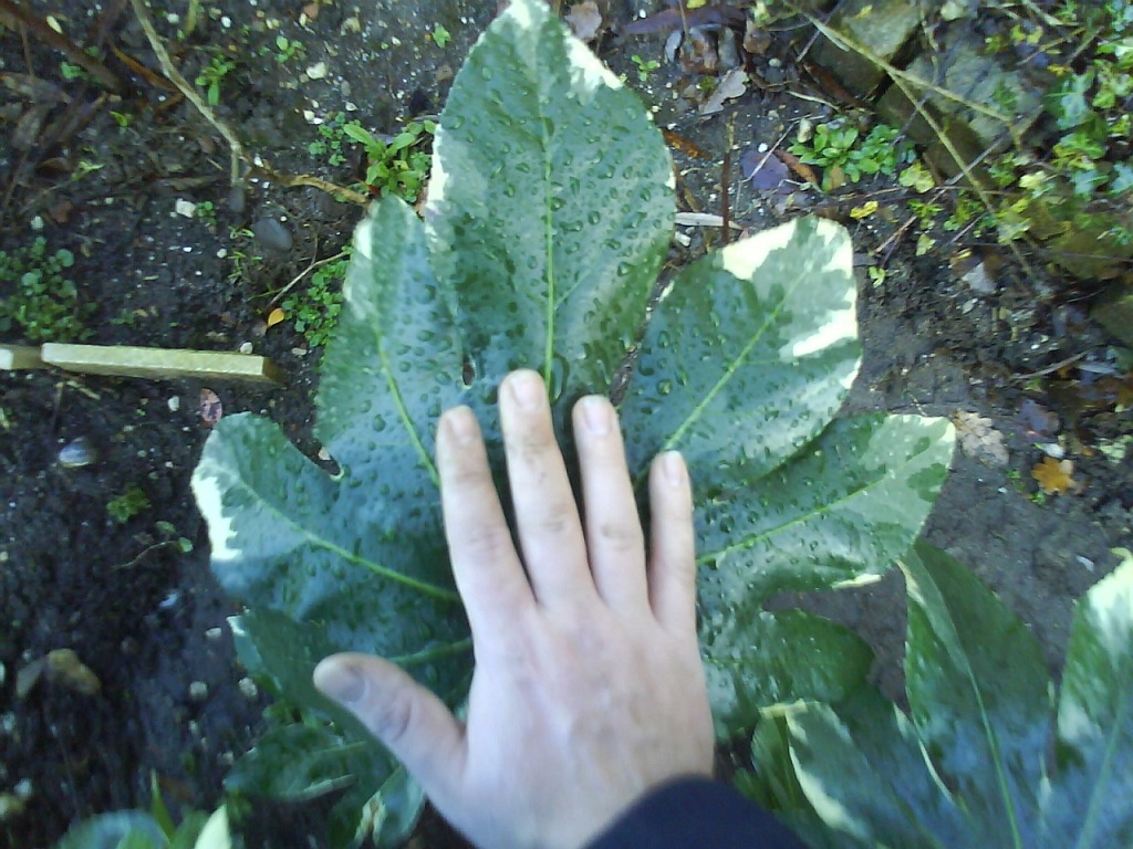 De lichtgroene 'veldsla-achtige' plantjes eromheen zijn goudsbloemen. De tuin stond er deze zomer vol mee en dit zijn waarschijnlijk nieuwe zaailingen. De vraag is of ze komende lente nog steeds zo groen zijn... :?