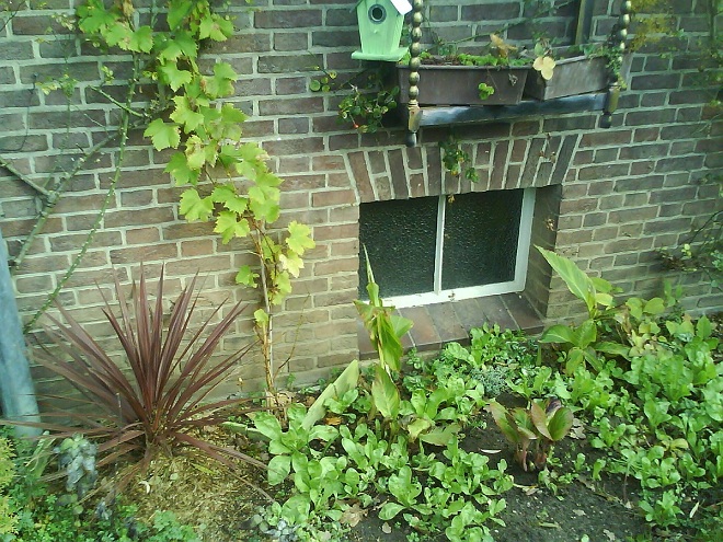 Zoals je ziet heb ik nog groene LEVENDE canna's in de volle grond staan. De canna's die ver van de muur staan zijn al wel dood. De wortels niet hoop ik, want ik graaf niks uit.