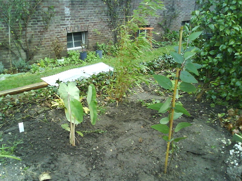 Op plek van oude struik Colocasia en Eucalyptus debeuzevillei