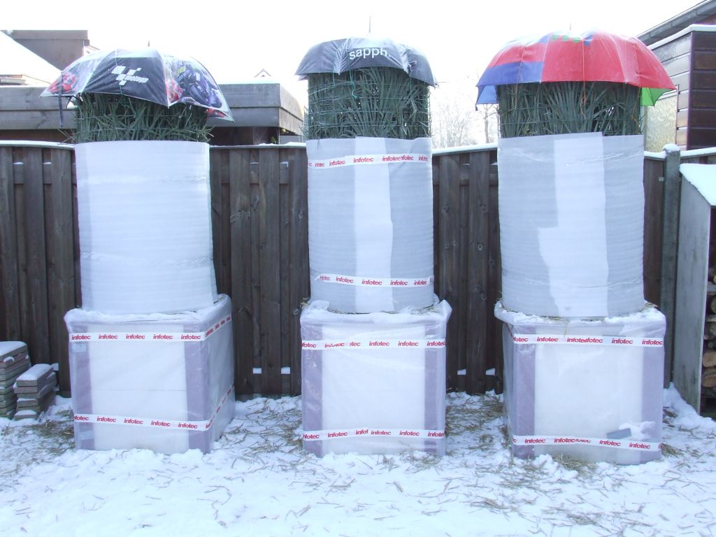 Nu maar goed beschermd en uit de wind geplaatst, 2 lagen bubbeltjeplastic om de pot heen, laag stro op de bovenkant van de wortels en stam heen, bladeren met gaas bij elkaar gebonden, wat extra witte folie om het gaas heen gewikkeld en om het af te maken alledrie een paraplu.