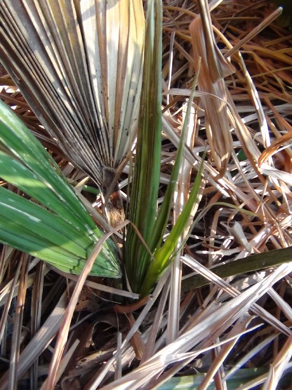 de sabal heeft het vorig jaar goed overleefd maar nu heeft hij het toch moeilijk gehad enkel 1 blad en de speer is nog groen