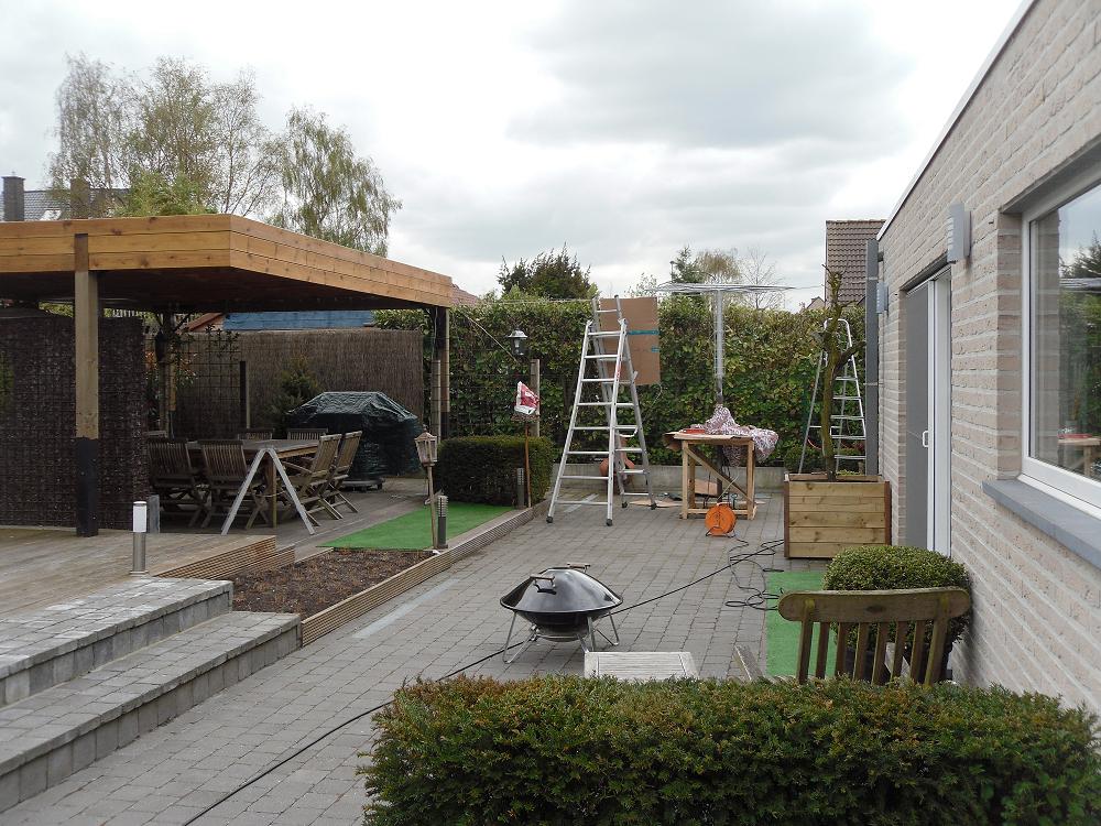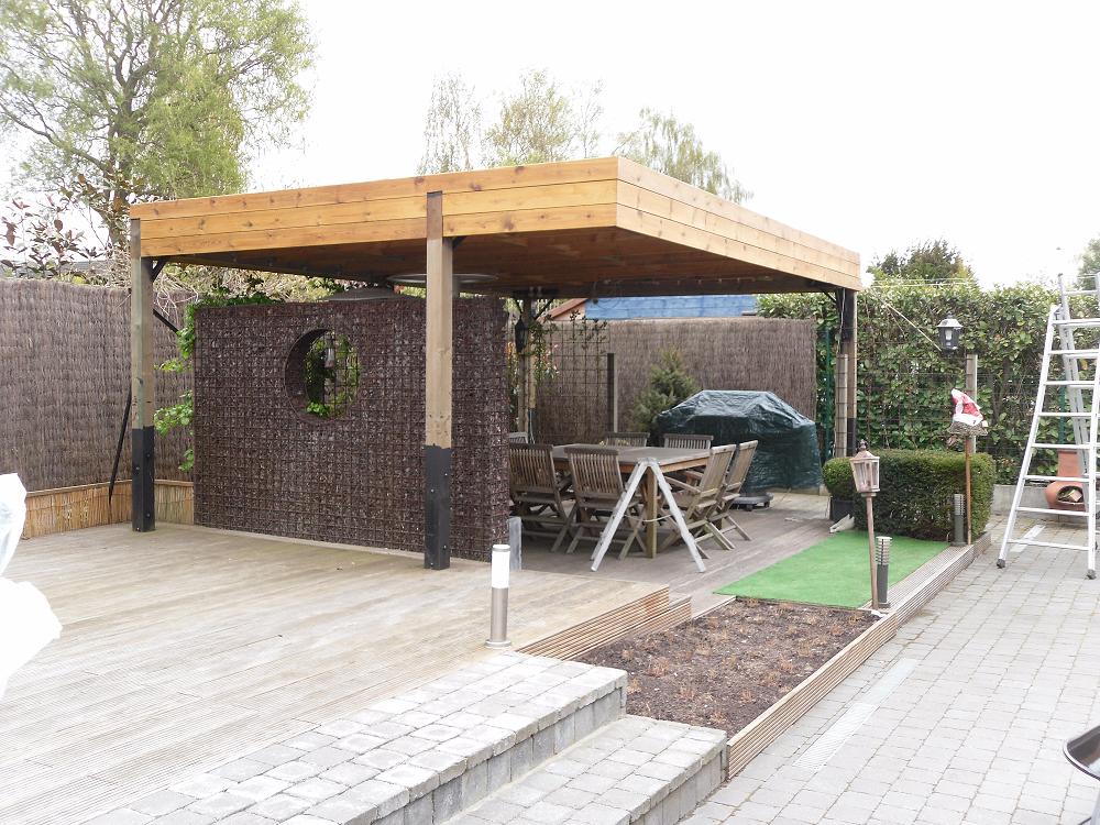 Wil even enkele foto's delen van de tuin van mijn vader. Vroeger was dit gewoon één plat grasveldje en zelf geen terras. Vorige winter maar eens begonnen met de transformatie.Eerst een verhoogd bankirai terras gebouwd en deze winter een dakconstructie en moestuinbak gebouwd. In de moestuinbak zitten alle graszoden en resten van de uitgegraven voortuin. De dakconstructie zal onderaan voorzien worden van erica matten en moeten we nog verven. Langs het dak staat een wand van schors. We hebben deze 2 jaar geleden gebouwd en dit was de eerste verandering. Ook een geboorde rotssteen als waterpartij maar is moeilijk te zien op de foto. In het midden is er siergras voorzien.