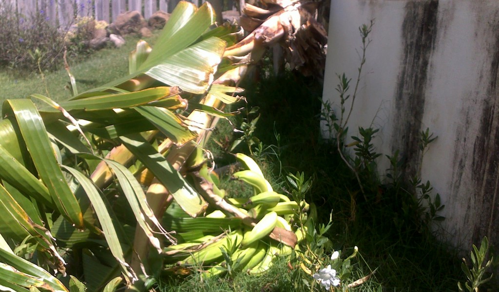verder achteraan staan er doorgaans bananen langs het zwembad. Deze hebben helemaal geen aandacht nodig, kunnen tegen de chloor van het zwembadwater en groeien als onkruid.