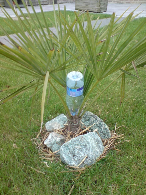 De Chamaerops humilis die zonder jasje in de vrieskoude staat