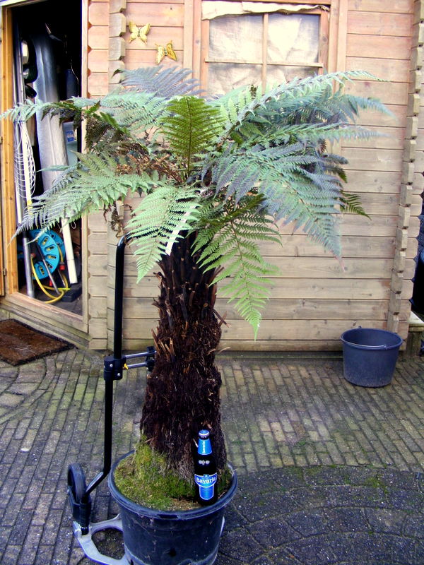Het is een Dicksonia fibrosa met een stam van 80cm, met wat verdord blad hier en daar ziet de varen er verder nog prima uit. Met de juiste verzorging moet dit helemaal goed komen! De wortels komen er ook onderuit, ik heb idee dat er nog maar weinig aarde in de kuip zit want de varen is met 1 hand te tillen, niet dat het slim is maar toch! 8-) . Van het voorjaar maar in een mooie kuip zetten en genieten maar!