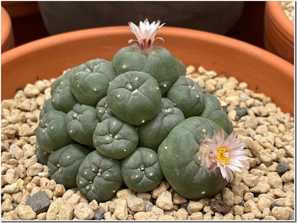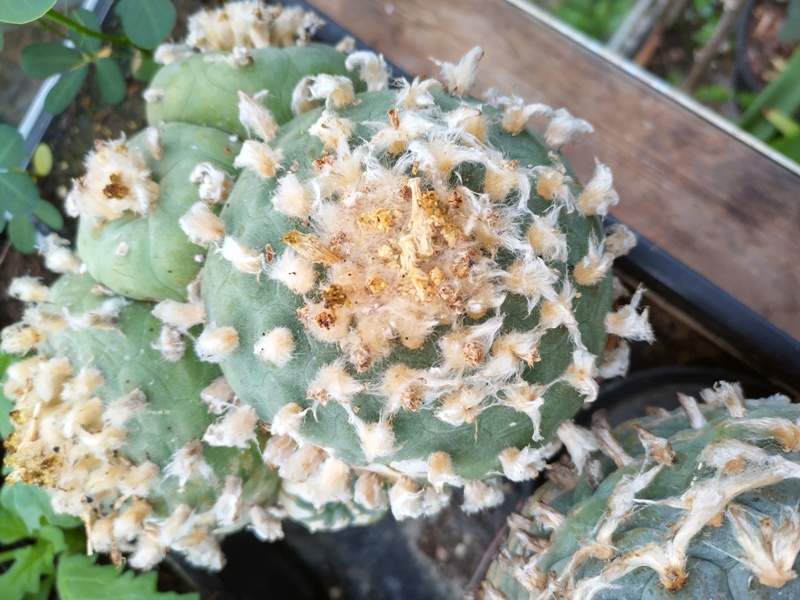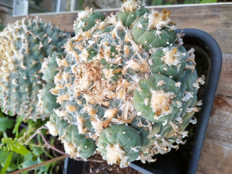 Al tientallen jaren heb ik een cactus die van grote gezinnen houdt zo te zien en mij verkocht is als Peyote, de Lopohora williamsii: