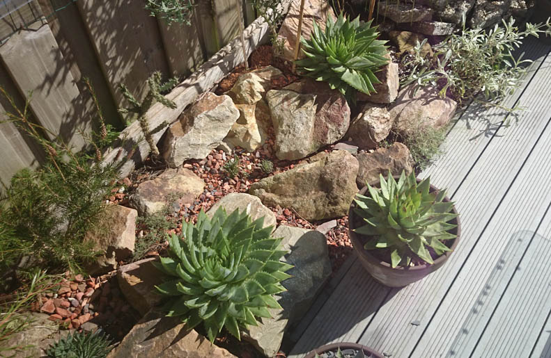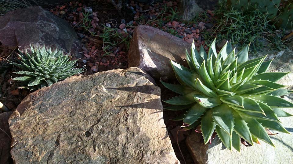 Na twee maanden schaduw komen de eerste winterzonnestralen de tuin weer in. De aloë's staan er prima bij. Laagste temperatuur was -6, laagste maximum temperatuur -2. Niets serieus maar toch.