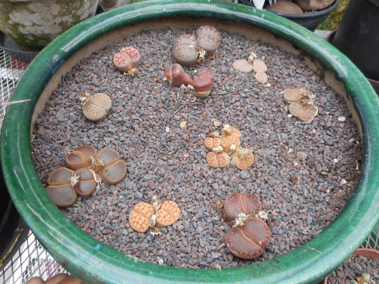 Lithops of levende steen zijn succulenten. In de natuur bevindt het grootste deel van de plant met zijn vlezige bladeren zich onder de oppervlakte en is alleen het 'afgeplatte bladvenster' zichtbaar. Ik heb een aantal in een ondiepe plantenbak staan hoog in de kas waar ze direct zonlicht krijgen. Het mengsel waarin ze groeien is luchtig doorlatende potgrond royaal vermengd met brekerszand dat is afgedekt met een laag fijn lavagrit. Het laatste kan ook bij het grondmengsel worden gevoegd. In de zomer giet ik ± elke 2 weken water rondom de planten zodat deze niet nat worden. De gepaarde bladeren worden in het voorjaar vernieuwd en draaien dan een kwartslag. aan het eind van de zomer verschijnen gele of witte bloemen. Resumé, een paludarium is geen geschikte omgeving voor Lithops die van herkomst woestijnplanten zijn. Warmte overdag is prima, 's nachts mag het kouder zijn tot vorstvrij en kurkdroog in de winter. Nevelen op hete dagen kan geen kwaad.