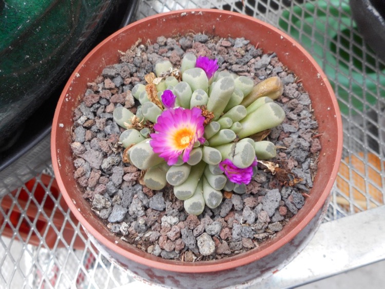 deze had dit nog niet toen ik ze in ontvangst nam maar nu dus wel , lijkt alsof dat steentje op die plaats een bloem zal gaan maken , voor zover ik er iets van ken dan toch hé ... Ik zie gewoon geen andere redenen waarom er zich plotseling een barstje lijkt te vertonen . Dit is temidden van de plant .