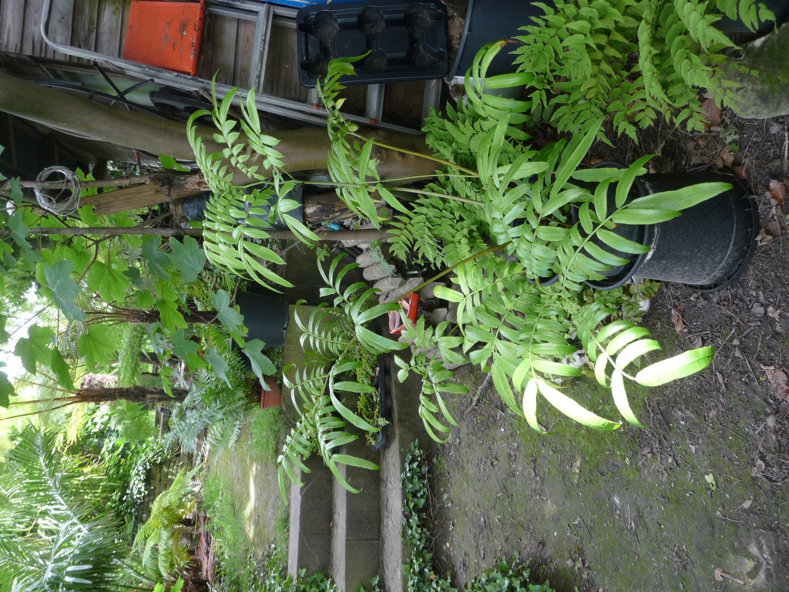 En de laatste die buitenkwam dit jaar is de Angiopteris evecta drie ik kreeg van Ro in 2012. Geen boomvaren maar een grote grondvaren die tot 2.5 m hoog kan groeien. hij wordt nog een maatje groter gezet en dan gaan we zien hoe deze het buiten gaat doen,