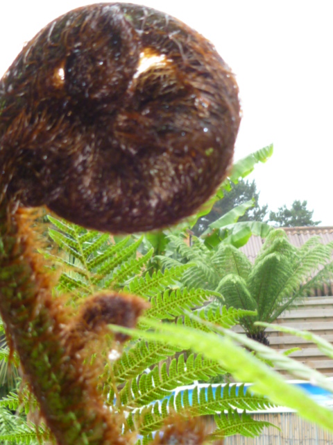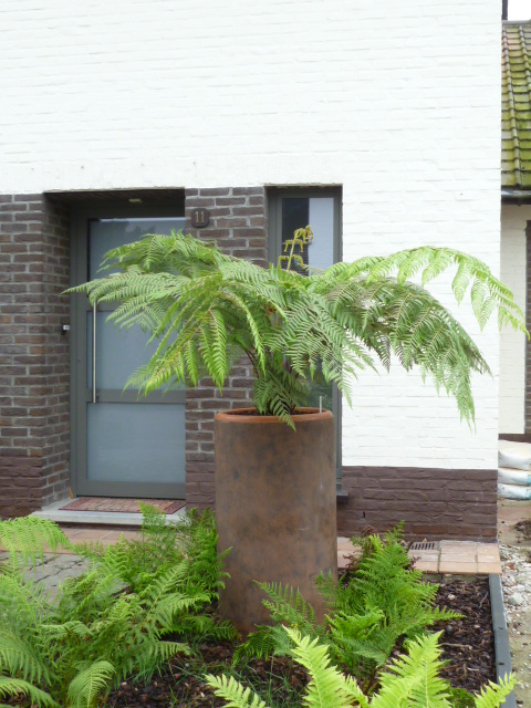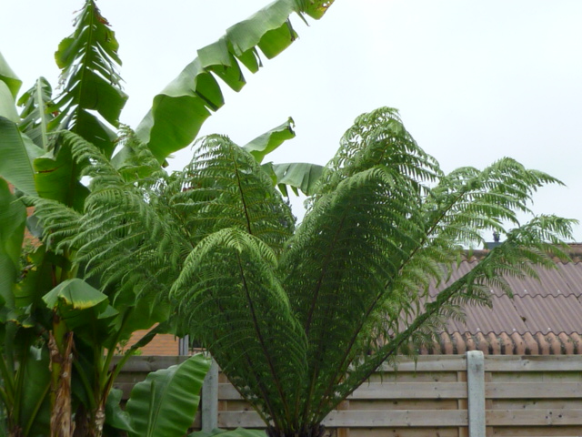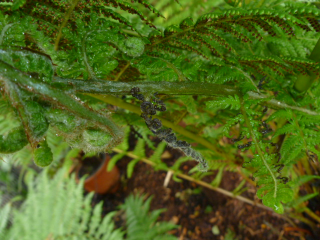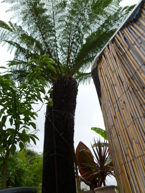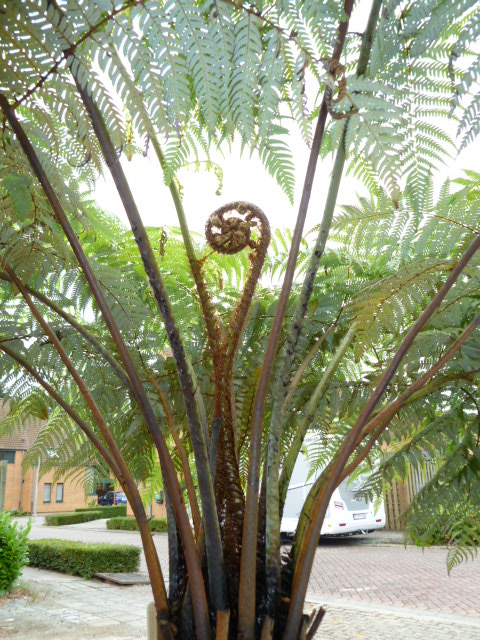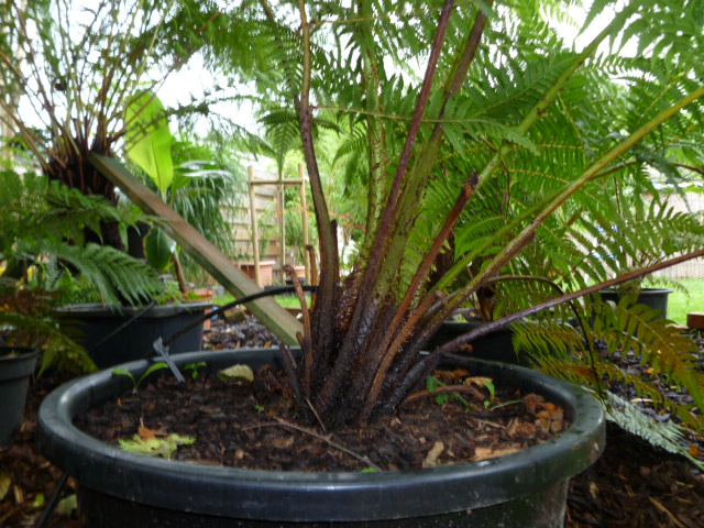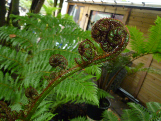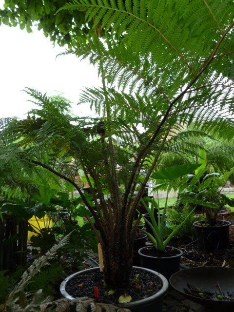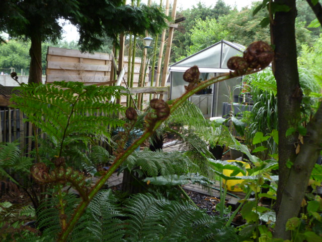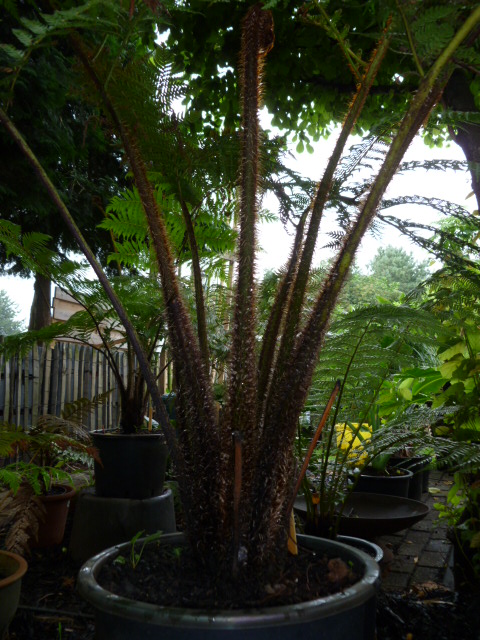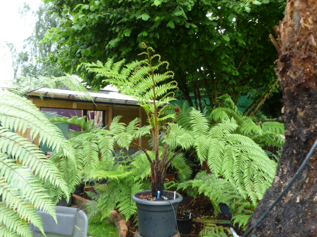 De kromme D.Sellowiana wat bijgetrimt beetje met beetje want veren waren de hoogte in gegaan omdat deze tss grotere boomvarens bij Ponga in de kas stond en opzoek moest gaan naar licht..