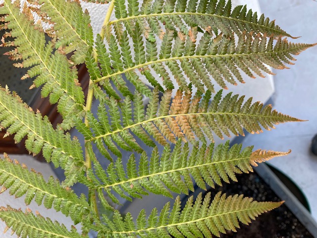 Verbranding is normaal als de varen niet gewend is aan zon, alle nieuwe blad wat nog gaat komen en die zon krijgt kan er dan ook beter tegen [het ligt er wel aan op welke tijd die 3 uur zijn] dat is minder gunstig op het midden van de dag, ochtend en avond zon kan het minste kwaad, een plek onder een boom of struik [halfschaduw] is het beste voor een mooie volle kroon te krijgen.