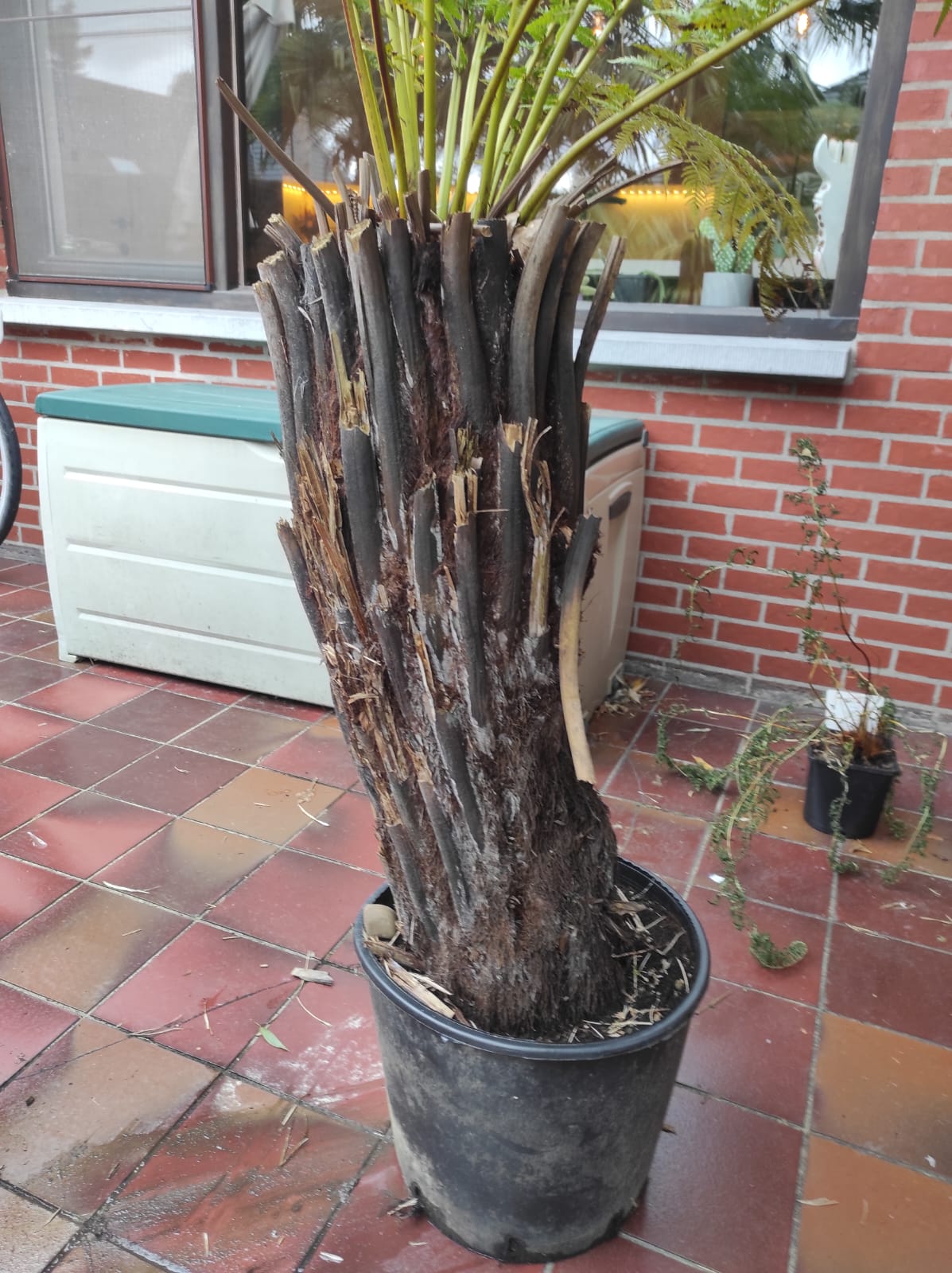 Wat me opviel bij deze plant is dat, zoals je op mijn eerste foto kan zien, de bladstelen die uit de stam komen nogal dun lijken, zeker als je ze vergelijkt met de bladresten op de zijkant van de stam. Vandaar dat ik het idee had dat de groei mogelijks wat geremd wordt.