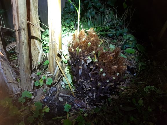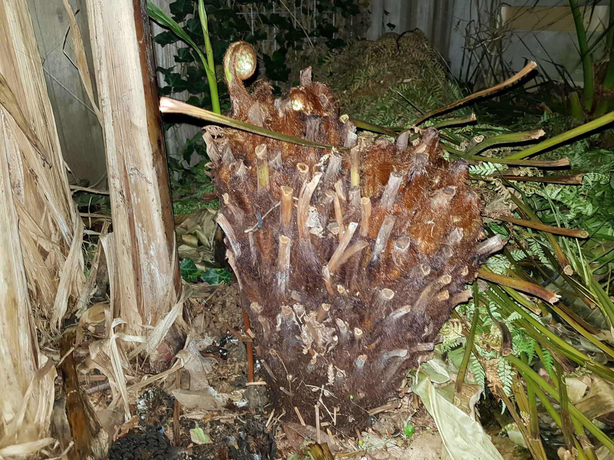 Nou, de schaar er toch ingezet. Dat er minder en kleinere veren terugkomen, zie ik nu maar even als een voordeel. Ik heb bijna zestig bladeren afgeknipt. Ergens met tegenzin, maar deze neemt echt veel te veel ruimte in zo. Ik moet aan de slag in die hoek. Ik ga een stuk of zes dikke basjoo stammen er uit spitten zodat de boomvaren wat meer ruimte krijgt. De basjoo is echt naar de boomvaren toe gegroeid waardoor alles naar voren werd geconcurreerd. Ik ga de Dicksonia goed beschermen en ben benieuwd wat er volgend jaar van terecht komt. Op alle snoeiwonden staat inderdaad nu een dikke druppel, maar echt doorlopen doet het niet. PS, voor de scherpzienden onder ons is nu goed te zien dat het hier om een tweekoppig exemplaar gaat.