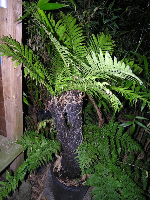 Het jonge exemplaar heb ik hooguit een jaar of 4 af tuincentrum. De ontwikkeling van de 'stam' verloopt best snel omdat de varen vrijwel het gehele seizoen doorgroeit. Dit exemplaar valt wel op door zijn krachtige groei. De kroondichtheid van de oude plant variëert per jaar afhankelijk van de vochtcondities. Dit jaar staat de varen voor het eerst in de schaduw en zit daardoor iets beter in blad. Vermoedelijk bepaald de stamdikte inderdaad de te bereiken hoogte. De meeste stamvormende Blechnumsoorten worden niet erg hoog. Een uitzondering is misschien Blechnum tabulare die een dikkere stam vormt, maar waarvan de ontwikkeling veel trager verloopt. Enige decennia geleden werd hier deze varen nog wel uit het wild aangevoerd met dikke stammen tot soms wel 1 m hoog.