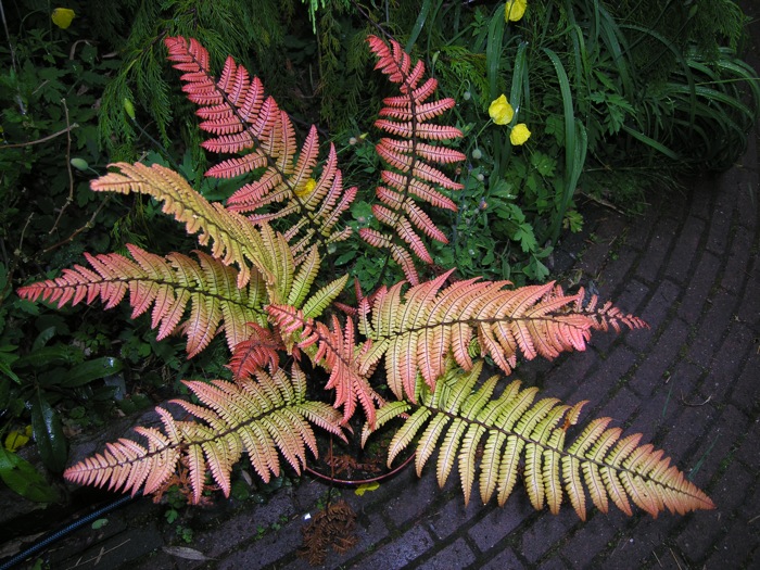 Ook al is de vraag van Hitch (Michael) inmiddels al opgelost, noem ik toch nog een paar andere rooduitlopende varensoorten zoals Woodwardia radicans, .